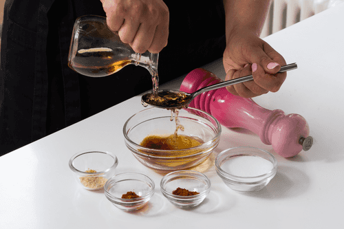 In a small bowl, mix bourbon, honey, brown sugar, and spices; season with salt and pepper.