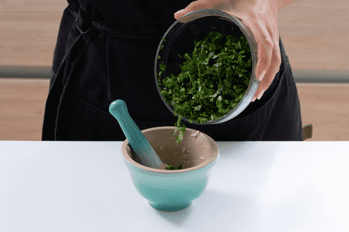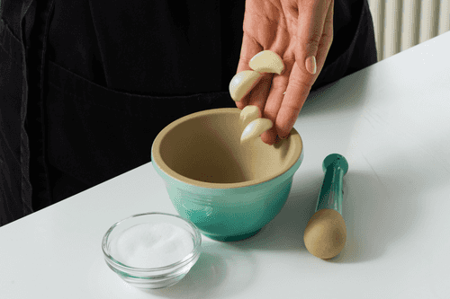 Pound 4 cloves of garlic with a pinch of salt into a smooth paste.