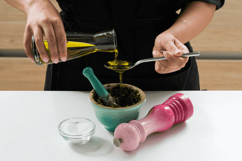 Mix lemon juice and 4 tablespoons of olive oil.