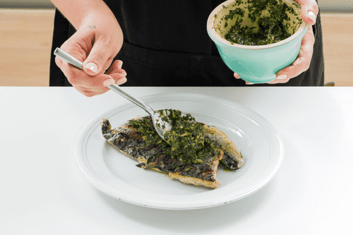 Place the green sauce on the prepared mackerel and serve.