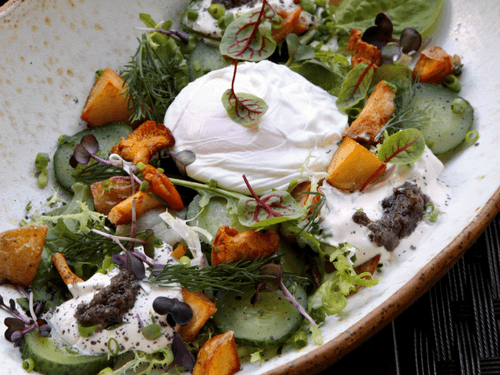 Warm salad with chanterelles and poached egg