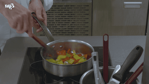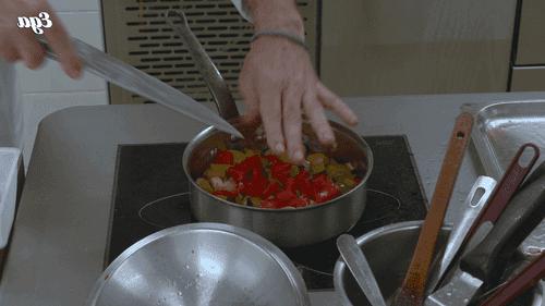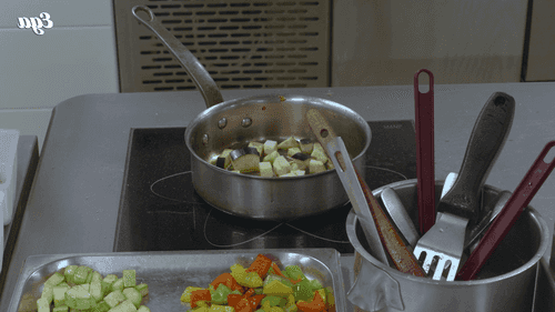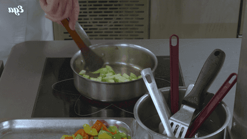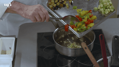 Finely chop the onion and fry it in olive oil without sugar. Add to the vegetables.