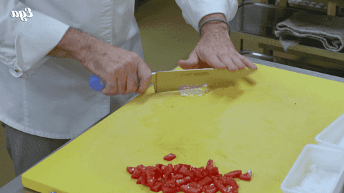 Cut the tomatoes with the skin into quarters, remove the seeds and core, and dice them.