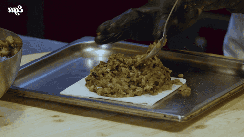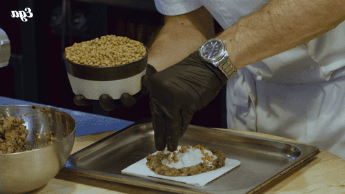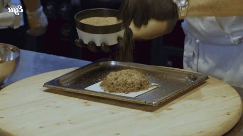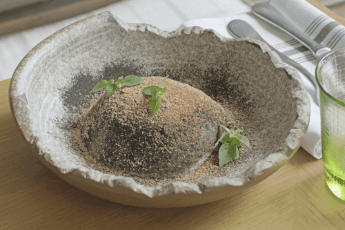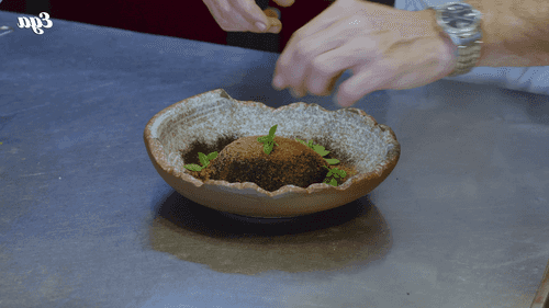 Layer the minced eggplant on top to completely cover the stracciatella and nuts. Shape the casserole into a hemisphere.