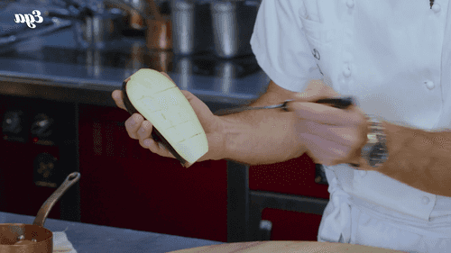 Make grid cuts in the flesh of the eggplants without touching the skin.