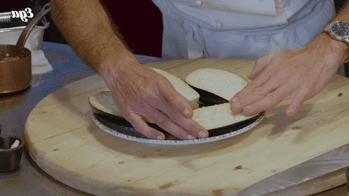 Place the eggplants on a flat dish and rub sea salt into each half. Cover the eggplants with plastic wrap and leave at room temperature for 30 minutes.