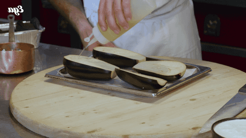 Place the eggplants on a baking sheet, drizzle with olive oil, and send to an oven preheated to 220 degrees for 12 minutes. Then let them cool for 10 minutes.