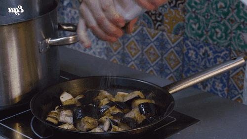 After a couple of minutes, add the eggplants, season with salt and pepper, and fry while stirring for 4-5 minutes.