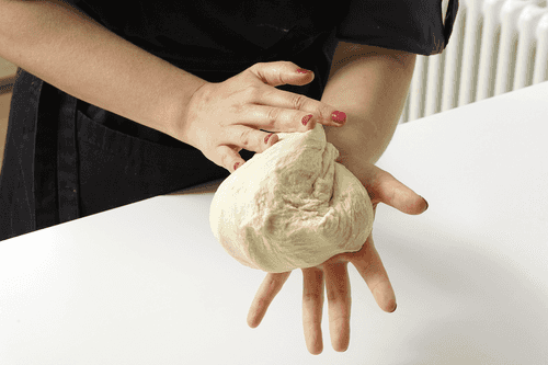 Check the dough in 10 minutes — it should easily come off your hands. If the dough sticks to your hands, add a little more flour and knead for another 5 minutes. Wrap the finished dough in plastic wrap and let it rest in the fridge for at least 30 minutes.