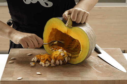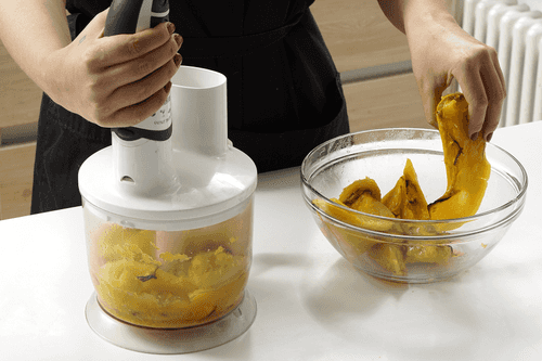 Separate the pumpkin flesh from the skin and blend until pureed.