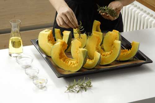 Sprinkle the pumpkin with rosemary leaves, coarsely chopped garlic, sugar, salt, and drizzle with oil.