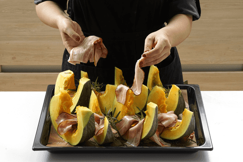 Remove the seeds from the pumpkin, cut it into large pieces without peeling, and place it on a baking sheet.