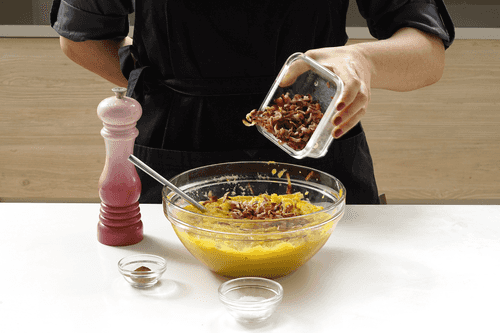 Chop the bacon into pieces of 3–5 mm. Set aside some chopped bacon for serving, and mix the rest with pumpkin puree. Taste the puree, add salt and pepper if needed. Add cinnamon.