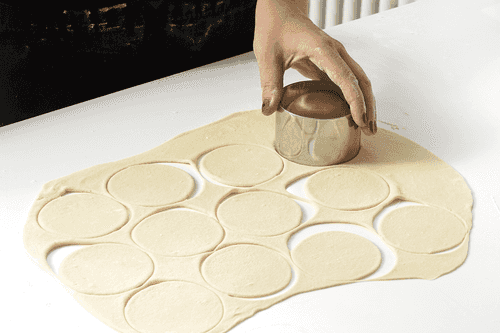 Roll out a portion of the dough and cut circles using a special cutter or a regular glass.
