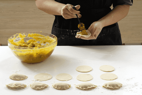 Place a spoonful of pumpkin filling on the dough circle and tightly seal the edges, trying not to leave air inside the dumpling. Place the finished dumplings on a floured surface.