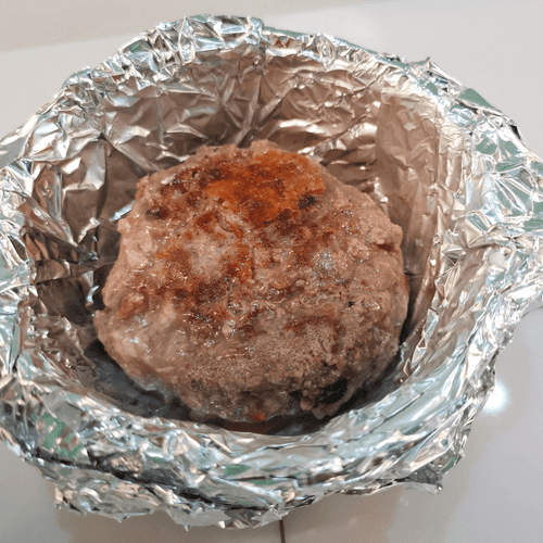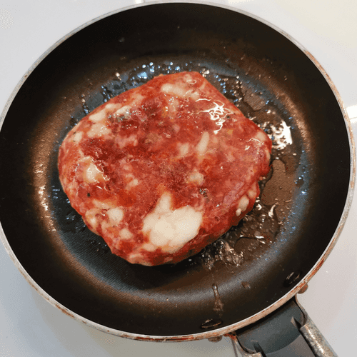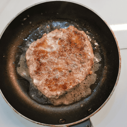 Salt the minced meat, shape it into a patty, and send it to the heated olive oil in the pan.