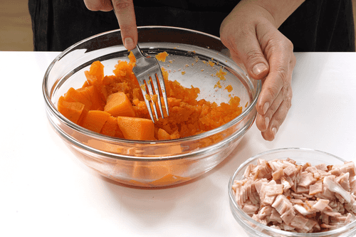 Mash the cooked sweet potato with a fork. Add bacon to it. Season with salt and pepper, and mix.