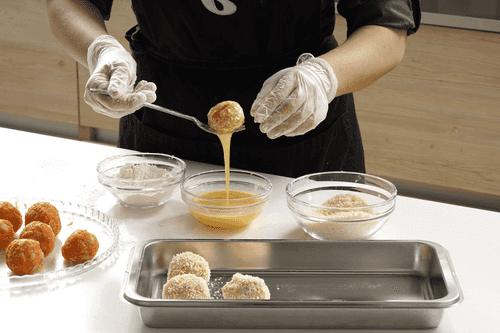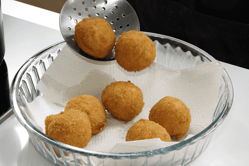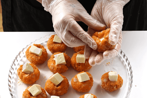 Make an indentation in the croquette, place a piece of cheese in the center, and form a ball. Do the same with the remaining croquettes.