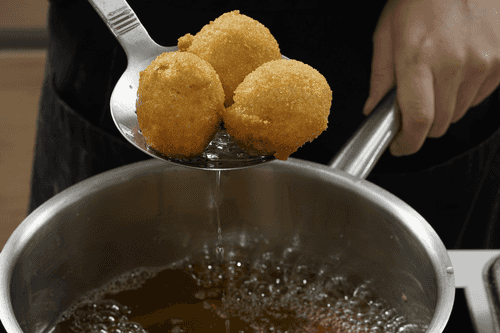 Fry the croquettes in heated vegetable oil at 180 degrees until golden brown.