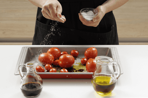 In a baking dish, mix cherry tomatoes and regular tomatoes (large tomatoes can be cut into two or four pieces). Add balsamic vinegar and sugar, 2 tablespoons of olive oil, season with salt and pepper. Place the tomatoes in a preheated oven at 170 degrees for 15 minutes.
