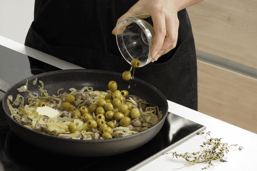 Add butter, thyme sprigs, olives, salt, and pepper.