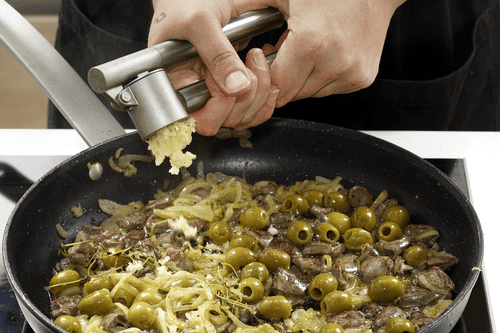 Press garlic onto the skillet. Mix everything and remove from heat.