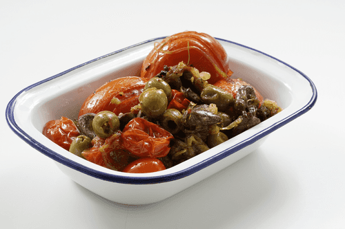 Transfer the fried hearts to the dish with the baked tomatoes. Bake for another 10 minutes at 170 degrees.