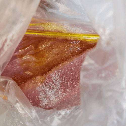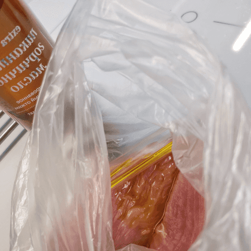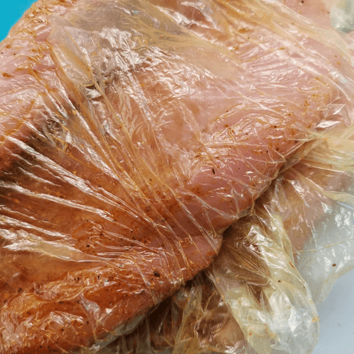 Put the meat in a bag and season with mustard oil.