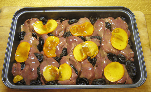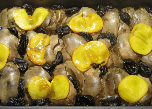 Place the liver, then fill all the free spaces and corners with prunes. Carefully pour the marinade into the mold and decorate with slices of persimmon.