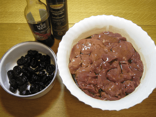 Marinate the liver in 4 tablespoons of soy sauce and 1 tablespoon of balsamic vinegar. Pour it over the liver and let it sit for 30 minutes (longer is fine, not critical).
