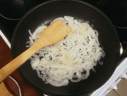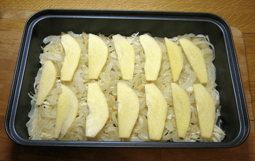 Layer the cabbage evenly in the baking dish, then spread the sautéed onions evenly on top.