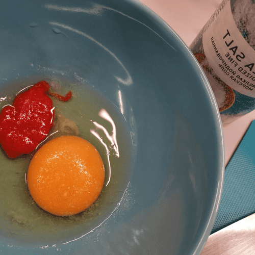 In a deep bowl, combine the egg and sriracha. Add salt.