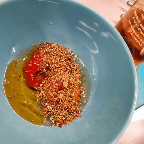 Add the remaining ingredients to the sauce leftovers and mix. Season with chili pepper.