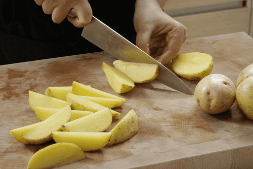 First, wash and cut the potatoes: large ones into wedges, medium ones in half, and very small ones can be left whole. It's important that all pieces are the same size, about a quarter of a chicken egg.