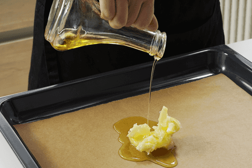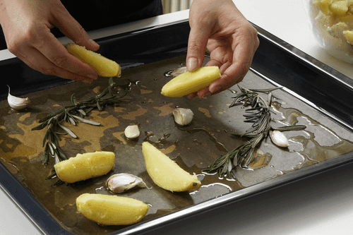 Slightly heat the baking tray, mix the contents with oil, and place the potatoes cut side up.