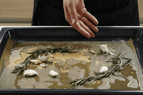 Crush the garlic cloves with a knife while still in their skins and place them in a baking tray. Also add the rosemary sprigs.