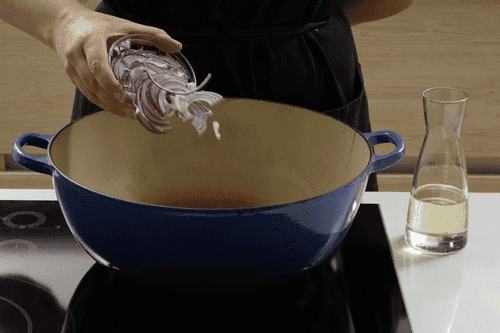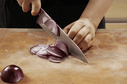Peel the red onion and slice it into thin half-rings.