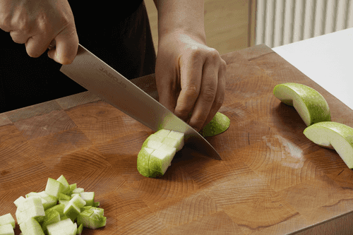 Remove the core with seeds from the apple and cut it into cubes.