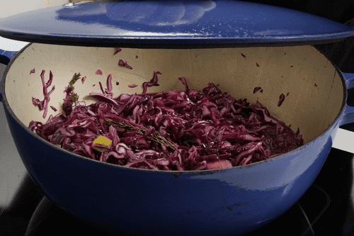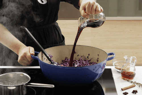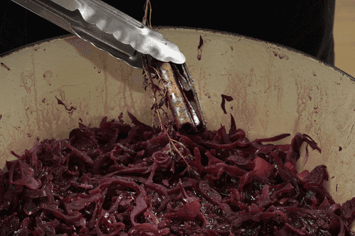 30 minutes before the cabbage is done, remove the lid and check: if all the liquid has evaporated, add a little water. In the end, remove the thyme sprigs, cinnamon, and star anise.