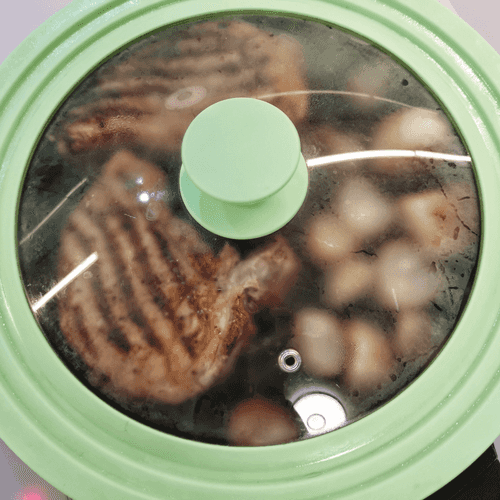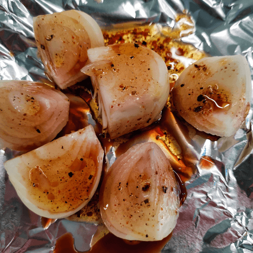 After 3-4 minutes, move the meat to form a pattern. Flip the onion.