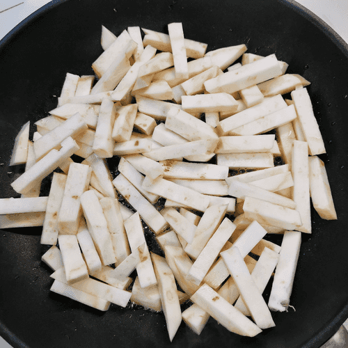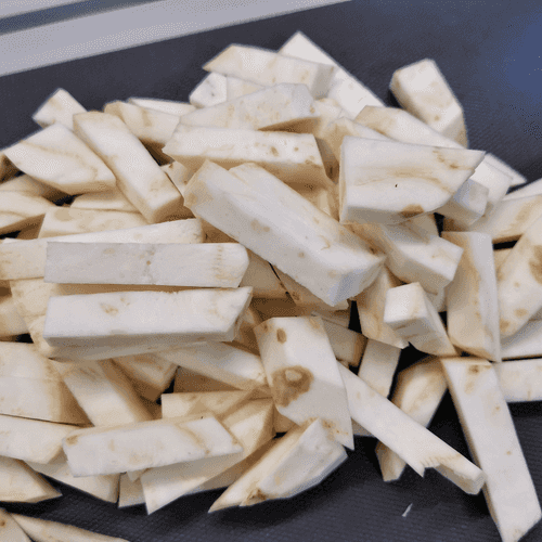 Peel the celery root and cut it into long sticks about 1 cm thick.