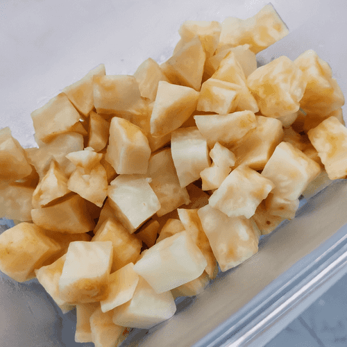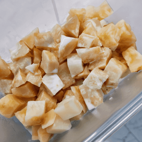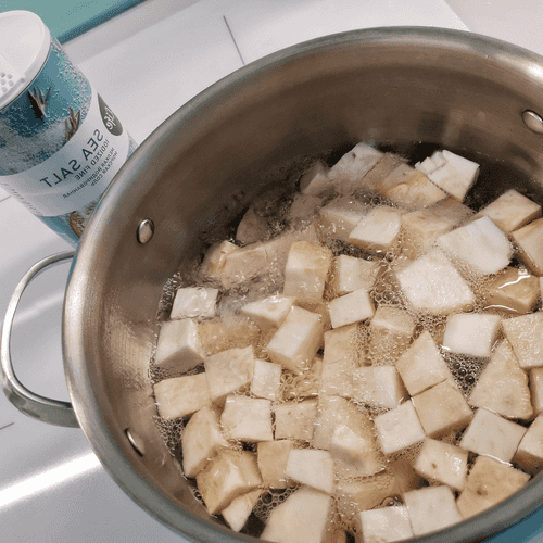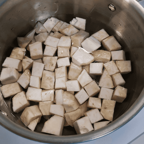 Peel the celery root and cut it into small cubes.