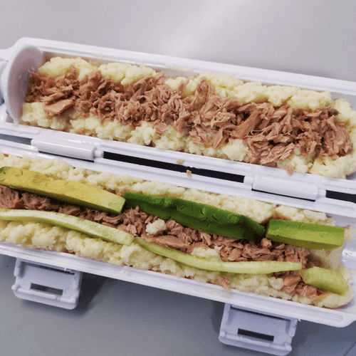 Pack the puree into the roll mold or generously grease the nori sheet. Place the tuna in the middle.