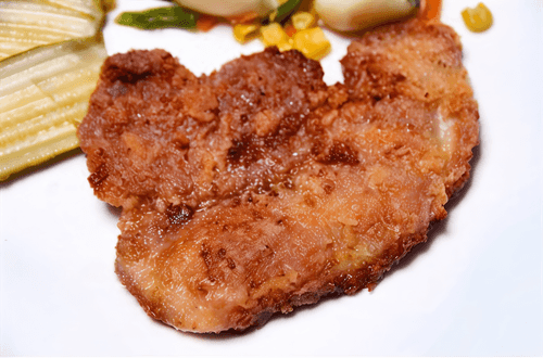 Cut the pork into portions, pound, salt, sprinkle with black pepper, coat in flour, dip in egg wash, coat in breadcrumbs, and fry in a pan until golden brown.