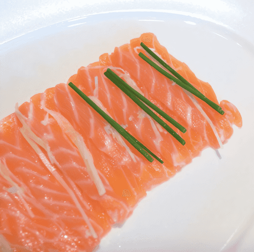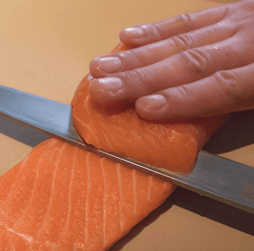 Slice the salmon belly into thin pieces against the grain. The key here is to use the belly: sweet meat and an extremely sharp knife. The knife should be sharp enough to prevent the delicate salmon meat from falling apart into separate fibers.