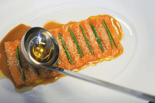 This is "new style sashimi": raw fish is scalded with boiling oil. The resulting sashimi retains most of the texture and flavor of raw salmon, while adding the aroma and slight flavor of fried fish to its assets. Nobu Matsuhisa's recipe - and those are his hands in the photos.