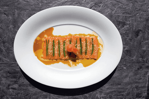All that remains is to add a side dish, like baked cherry tomatoes, on top of the salmon slices. Serve while the salmon is still warm from contact with the hot oil and hasn't fully absorbed the sauce. Capturing that moment is the best reward.