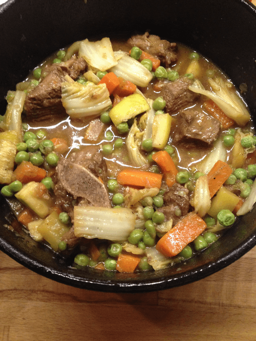 After that, transfer the lamb with a slotted spoon to a shallow pot; on top of the lamb, place the cleaned and washed cabbage, diced carrots, onions, sliced turnips, and potatoes, along with bay leaves, pepper, and cloves.