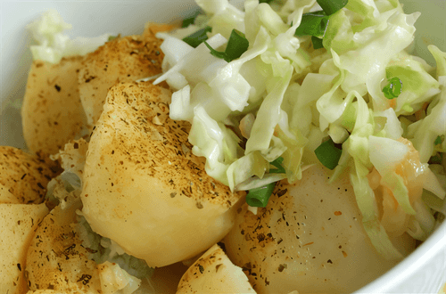 Wash the potatoes and carrots, boil them, let them cool, and peel. Slice them, add sauerkraut and finely chopped onion (either bulb or green). Dress the salad with mayonnaise or sour cream.