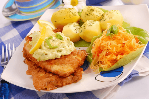 Garnish the cooked fish with mashed potatoes, lemon, and serve with tartar sauce.